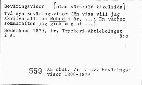 //// Beväringsvisor [utan särskild titelsida"! //// Två nya Beväringsvisor (En visa vill jag skrifva allt om Mohed i år, En vacker //// sommarafton jag giclTmig ut „,.) //// Söderhamn 1879, tr. Tryckeri-Aktiebolaget 2 s. 8:0 //// ccrq KB okat. Vitt. sv, beväxings- //// visor 1800-1879 ////