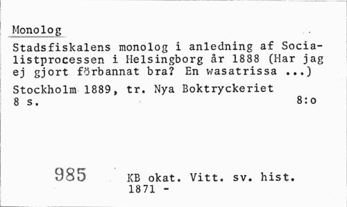 //// Monolog //// Stadsfiskalens monolog i anledning af Socialistprocessen i Helsingborg år 1888 (Har jag ej gjort förbannat bra? En wasatrissa ...) //// Stockholm 1889, tr. Nya Boktryckeriet 8 s. 8:o //// 985 KB okat. Vitt. sv. hist. //// 1871 - ////