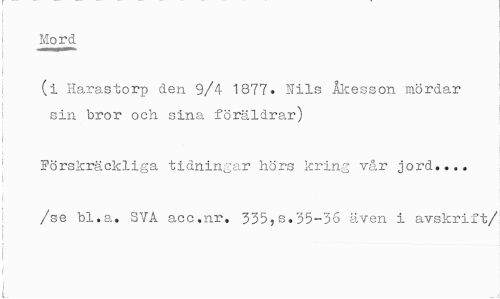 //// Mord //// (i Harastorp den 9/4 1877. Nils Åkesson mördar sin. bror och sina föräldrar) //// Förskräckliga tidningar hörs kring vår jord... //// /se bl.a. SVA acc.nr. 335,s.35-36 även i avskrift/ ////