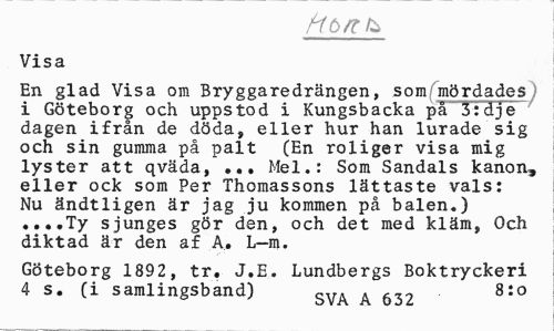 //// Ht it & //// Visa //// En glad Visa om Bryggaredrängen, som mördades i Göteborg och uppstod i Kungsbacka på %:dje dagen ifrån de döda, eller hur han lurade sig och sin gumma på palt (En roliger visa mig lyster att qväda, ... Mel.: Som Sandals kanon, eller ock som Per Thomassons lättaste vals: Nu ändtligen är jag ju kommen på balen.) ...Ty sjunges gör den, och det med kläm, Och diktad är den af A, L-m. //// Göteborg 1892, tr. J.E. Lundbergs Boktryckeri 4 s. (i samlingsband) SVA A 632 8:0 ////