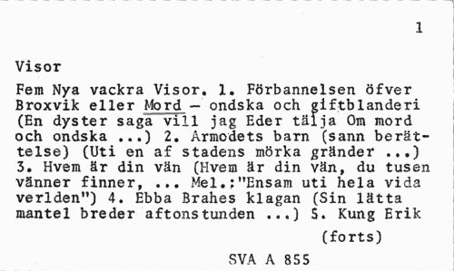 //// 1 //// Visor //// Fem Nya vackra Visor. 1. Förbannelsen öfver Broxvik eller Mord — ondska och giftblanderi (En dyster saga vill jag Eder tälja Om mord och ondska ...) 2. Armodets barn (sann berättelse) (Uti en af stadens mörka gränder 3. Hvem är din vän (Hvem är din vän, du tusen vänner finner, ... Mel.:"Ensam uti hela vida verlden") 4. Ebba Brahes klagan (Sin lätta mantel breder aftonstunden ...) S. Kung Erik //// (forts) //// SVA A 855 ////