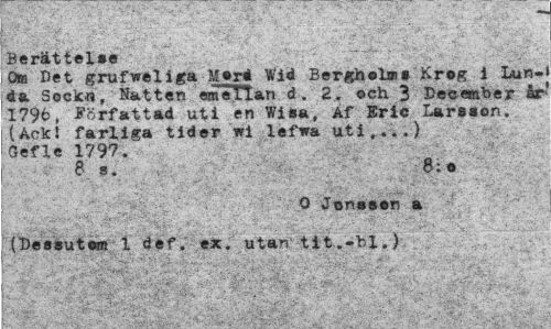 //// Berättelse //// Om Det grufweliga UM Wid Beruhol®. Krog i Lun. //// ^Q^i-^ +rr fF^K" d- 2- och 3 Decmber k //// 1796 iorfattad uti en Wisa, Af Eric Larsson. Uek! farliga tider wi lefwa uti ...) Gefle 1797. ---' //// ¦ B « - ¦ //// 0 Jonsson a (Dessutom 1 def. ex. utan tit..bl.) ////