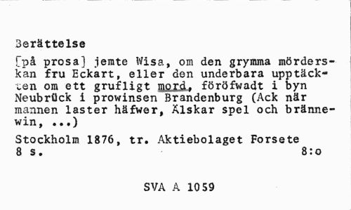 //// Berättelse //// Tpå prosa] jemte Wisa, om den grymma mörders-kan fru Eckart, eller den underbara upptäckten om ett grufligt fflflXfiU föröfwadt i byn Neubröck i prowinsen Brandenburg (Ack när mannen laster häfwer, Älskar spel och bränne-win, ...) //// Stockholm 1876, tr. Aktiebolaget Forsete 8 s. 8:0 //// SVA A 10 59 ////