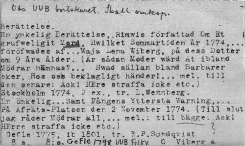 //// o**, I/WÖ uo^w^. JL^il //// Berättelse. //// [In ymkelig Eerättelse f. ftimv/is författad Om Et srrufweligit Mord - Hwilket Sommartiden år 1774,.,. foröfwades af...Maja Lena Wiberg, pa dess Dotter om 9 års ålder. (Är sådär. Moder wärd Åt ibland Mödrar nämna»?... ITwad sällan bland Barbarer sker, Hos osfc beklagligt händert.,. mel. till äen senare; Ackl HEre straffa icke etc.) Stockholm 1774, ? ex., tr. L.Wennberg. En'ömkelig...Samt Fångens Yttersta Warning,... På Afräts-Platsen den 2 November 1774. (Till slut jag råder Mödrar all,... mel.; till bägge: Ackl HErre straffa icke etc.) " Z //// Gefle 17V5, it 1601, tr. E.P.Sundqvist P * P: ö. CreFIe nq<t //l/R Ktkru c Vlberc- s ////