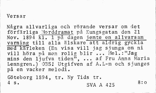 //// Vers ar //// Några allvarliga och rörande versar om det förfärliga Morddramat på Kungsgatan den 21 Nov. 1894 kl. i"på dagen jemte en allvarsam varning till alla älskare att aldrig gyckla med kärleken (En visa vill j ag s i unga om ni vill höra på men rolig blir ... Mel.:"Jag mins den ljufva tiden", ... af Fru Anna Maria Lenngren.) OBS i Utgifven af A.L-m och si unges på en vacker melodi. //// Göteborg 1894, tr. Ny Tids tr. //// 4 s* SVA A 425 8:0 ////