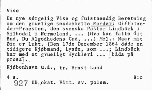 //// Vise //// En nye s^rgelig Vise og fulstaendig Beretning om den gruelige sexdobbelte Morder: Giftblan-der=Praesten, den svenska Pastor Lindbäck i Silbodal i Wermeland, ... (Hvo kan fatte dit Bud, Du Algodhedens Gud, ...) Mel.: Naar mit 0ie er lukt. (Den 17de December 1864 d0de en tidigere Kjjrfbmand, Lysén, som ...j Lindbäck har med et grueligt Hyckleri ... fbåda på prosa... //// Kj^benhavn u.å., tr, Ernst Lund //// 4 s. 8:0 //// 927 KB okat« vitt. sv. polem. ////