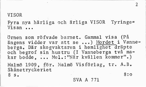 //// 2 //// VISOR //// Fyra nya härliga och ärliga VISOR Tyringe= Visan ... //// örnen som röfvade barnet. Gammal visa (På ängens vidder var att se ...) Mordet i Vanne-berga. Där skogvaktaren i hemlighet dräpte och begrof sin hustru (I Vanneberga två makar bodde, ... Mel.:"När kvällen kommer".) //// Malmö 1909 , för. Malmö Vis förlag, tr. A.B. Skånetryckeriet //// 8 s. 8:o //// SVA A 7 71 ////