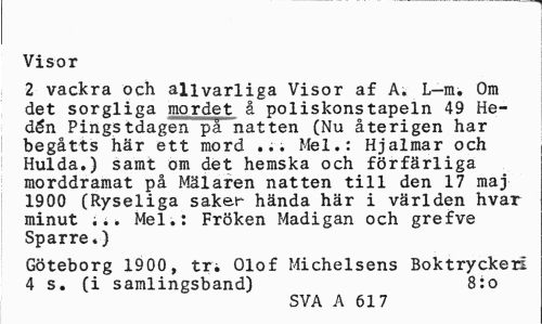 //// Visor //// 2 vackra och allvarliga Visor af A. L—m. Om det sorgliga mordet å poliskonstapeln 49 Hedén Pingstdagen på natten (Nu återigen har begåtts här ett mord ... Mel.: Hjalmar och Hulda.) samt om det hemska och förfärliga morddramat på Mälaren natten till den 17 maj 1900 (Ryseliga saket- hända här i världen hvar minut Mel.: Fröken Madigan och grefve Sparre.) //// Göteborg 1900, tri Olof Michelsens Boktryckeri 4 s. (i samlingsband) 8:o //// SVA A 617 ////