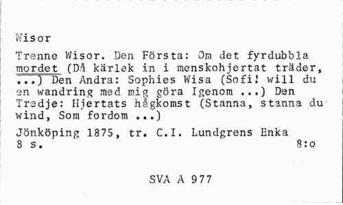 //// Wisor //// Trenne Wisor. Den Första: Om det fyrdubbla mordet (Då kärlek in i menskohjertat träder, ...) Den Andra: Sophies Wisa (Sofi.' will du en wandring med mig göra Igenom ...) Den Tredje: Hjertats hågkomst (Stanna, stanna du wind, Som fordom ...) //// Jönköping 1875, tr. C.I. Lundgrens Enka 8 s. 8:0 //// SVA A 9 77 ////