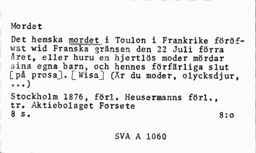//// Mordet //// Det hemska mordet i Toulon i Frankrike föröf-wat wid Franska gränsen den 22 Juli förra året» eller huru en hjertlös moder mördar sina egna barn, och hennes förfärliga slut [på prosaj. [ WisaJ (Är du moder, olycksdjur, //// o fl • ) //// Stockholm 1876, förl. Heusermanns förl., tr. Aktiebolaget Forsete //// 8 s. 8:o //// SVA A 1060 ////