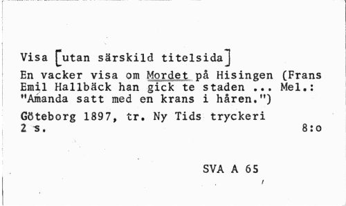//// Visa [utan särskild titelsida] //// En vacker visa om Morde t på Hisingen (Frans Emil Hallbäck han gick te staden ... Mel.: "Amanda satt med en krans i håren.") //// Göteborg 1897, tr. Ny Tids tryckeri 2 s. 8:0 //// SVA A 65 //// 1 ////