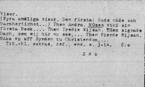 //// Visor. //// (Fyra andliga visor. Der första: Guds rade och fcarmhertighet...} Then Andra, MOges vthi sin första Book,.,. Then Tredie Wijsan, THen signade Dagh, som wij hur rni see,,Then Fierde Wijsan. wAka vp aff Synden tu Christerd om, .. . //// Tit.-bl. saknas, def„, <?rd. s. 3-14. 6; o //// Z d b ////