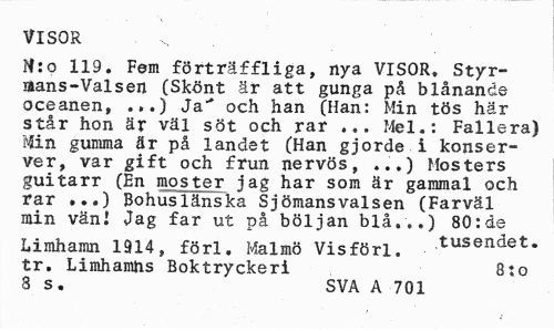 //// VISOR . v //// N:o 119. Fem förträffliga, nya VISOR. Styrmans-Valsen (Skönt är att gunga på blånande oceanen, ...) Ja"* och han (Han: Min tös här står hon är väl söt och rar ... Mel.: Fallera) Min gumma är på landet (Han gjorde i konserver, var gift och frun nervös, ...) Mosters guitarr (En moster jag har som är gammal och rar ...) Bohuslänska Sjömansvalsen (Farväl min vänl Jag far ut på böljan blå...) 80:de //// Limhamn 1914, förl. Malmö Visförl. tusendet. tr. Limhamhs Boktryckeri 8:0 //// 3 s. SVA A 701 ////