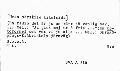 //// lUtan särskild titelsida") //// (En radio det är ju en rätt så vanlig sak, ... Mel.: "Ja gick mej ut å fria .,.";En motorcykel det vet vi ju alla ... Mel.: Skralcö-pmgs-Kråkvinkels järnväg) //// U.o.o.å, //// 4 s, 8:0 //// i //// SVA A 816 ////