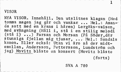 //// X //// VISOR //// NYA VISOR. Innehåll. Den utslitnes klagan (Med tomma magen jag går och vankar. ... Mel.: Amanda satt med en krans i håren) Lergöks-valsen, med svängning (Håll i, stå i en stilig melodi (stå i) ...) Farsan och Morsan (På Söder,där stunsiga fjellan mig tjusar, ... Mel.: Sandals kanon. Eller också: Utan vi äro så der rnidt-emellan, Andersson, Pettersson, Lundström och jag) Movitz blåste en konsert (Movitz blåste //// (forts) //// SVA A 780 ////