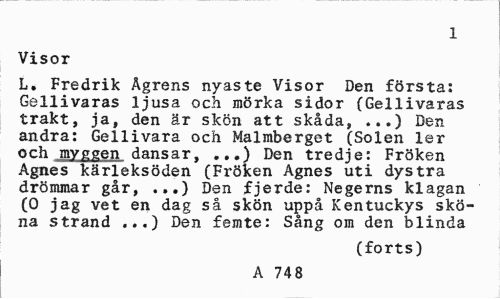 //// 1 //// Visor //// L. Fredrik Ågrens nyaste Visor Den första: Gellivaras ljusa och mörka sidor (Gellivaras trakt, ja, den är skön att skåda, ...) Den andra: Gellivara och Malmberget (Solen ler och myggen dansar, ...) Den tredje: Fröken Agnes kärleksöden (Fröken Agnes uti dystra drömmar går, ...) Den fjerde: Negerns klagan (0 jag vet en dag så skön uppå Kentuckys sköna strand ...) Den femte: Sång om den blinda //// (forts) //// A 748 ////