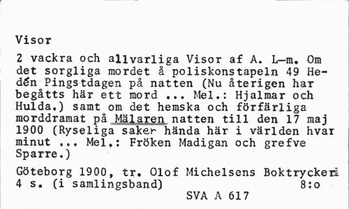 //// Visor //// 2 vackra och allvarliga Visor af A. L-m. Om det sorgliga mordet å poliskonstapeln 49 Hedén Pingstdagen på natten (Nu återigen har begåtts här ett mord ... Mel.: Hjalmar och Hulda.) samt om det hemska och förfärliga morddramat på Mälaren natten till den 17 maj 1900 (Ryseliga saker hända här i världen hvar minut ... Mel,: Fröken Madigan och grefve Sparre.) //// Göteborg 1900, tr, Olof Michelsens Boktryckeli 4 s. (i samlingsband) 8:o //// SVA A 617 ////