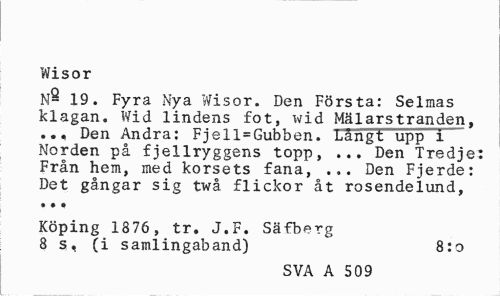 //// Wisor //// N- 19. Fyra Nya Wisor. Den Första: Selmas klagan. Wid lindens fot, wid Mälarstranden, ... Den Andra: Fjell=Gubben. Långt upp i Norden på fjellryggens topp, ... Den Tredje: Från hem, med korsets fana, ... Den Fjerde: Det gångar sig twå flickor åt rosendeiund, ... //// Köping 1876, tr. J.F. Säfberg 8 s, (i samlingaband) 8:o //// SVA A 509 ////