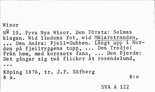//// Wisor //// N- 19. Fyra Nya Wisor. Den Första: Selmas klagan. Wid lindens fot, wid Mälarstranden, ... Den Andra: Fjell=Gubben. Långt upp i Norden på fjellryggens topp, ... Den Tredje: Från hem, med korssets fana, ... Den Fjerde: //// Det gångar sig twå flickor åt rosendelund, • • •• //// Köping 1876, tr. J.F. Säfberg 8 s. 8:o //// SVA A 122 ////