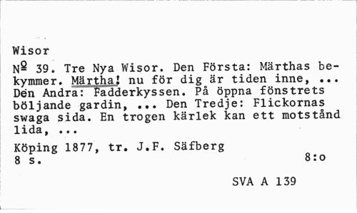 //// Wisor //// N- 39. Tre Nya Wisor. Den Första: Märthas bekymmer. Märtha! nu för dig är tiden inne, ... Den Andra: Fadderkyssen. På öppna fönstrets böljande gardin, ... Den Tredje: Flickornas swaga sida. En trogen kärlek kan ett motstånd lida, ... //// Köping 1877, tr. J.F. Säfberg 8 s. 8:o //// SVA A 139 ////