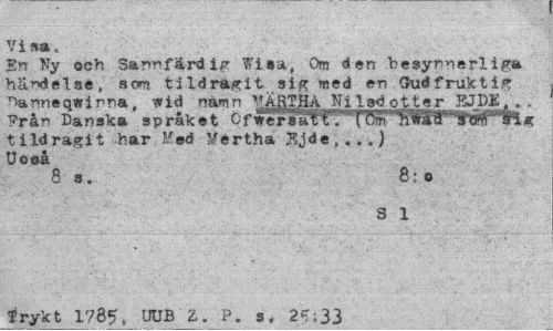 //// Vi sa, //// En Ny och 3a«nfärd ir Wiaa, Om den besynnerliga händelse, som tildragit sig med en Oudfruktig nanneqwinna, wid namn ^<ABTHAg^g^^tterEJDg,, . Från Danska språket ÖfwersatfT>st"Omg tildragit .har Med ?/ertha Ejde, .. .) Uooå //// 8 s. 8:0 //// i ryk t 1785» UUB Z. P. s, 2«-;33 ////