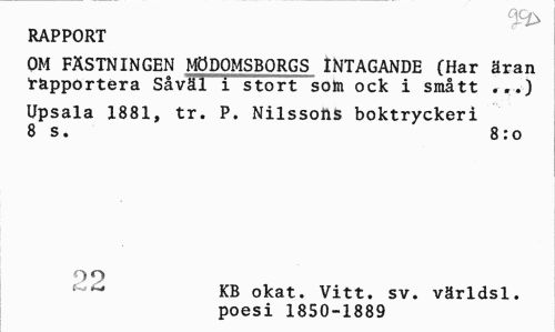 //// RAPPORT //// OM FÄSTNINGEN MÖDOMSBORGS INTAGANDE (Har äran Ir&pportéra Såväl i stort som ock i smått ...) //// Upsala 1881, tr. P. Nilssons boktryckeri 8 s. 8:0 //// KB okat. Vitt. sv. världsl. //// poesi 1850-1889 ////