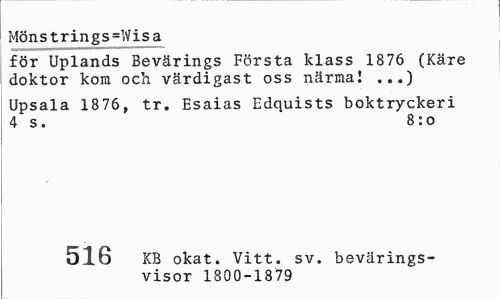 //// Möns trings=Wis a //// för Uplands Bevärings Första klass 1876 (Käre doktor kom och värdigast oss närma! ...) //// Upsala 1876, tr. Esaias Edquists boktryckeri 4 s. 8:o //// 396 KB okat. Vitt. sv. bevärings- //// visor 1800-210 ////