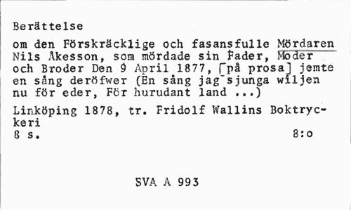 //// Berättelse //// om den Förskräcklige och fasansfulle Mördaren Nils Åkesson, som mördade sin Fader, Moder och Broder Den 9 April 1877, fpå prosa] jemte en sång deröfwer (Én sång jag"sjunga wiljen nu för eder, Fcr hurudant land //// Linköping 1878, tr. Fridolf Wallins Boktryckeri //// 8 s. 8:o //// SVA A 993 ////