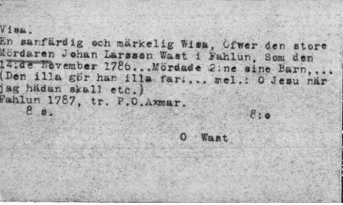 //// 5n sanfärdig och märkelig Wisa, Gfwer den store icrdaren Johan Larsson Wast i Fahlun, Sörj den t T; "fl f'"' R fe v em b e r 1786.. .Mördade 2; ne aine Barn,... [Den illa gör har illa far;... mel.; 0 Jesu när jag hädan skall etc.) ?ahlun 1787, tr. P.O.Axmar. //// 8a. 8:• //// 0 Wast ////