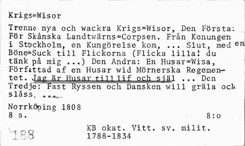 //// Krigs=Wisor //// Trenne nya och wackra Krigs=Wisor, Den Första; För Skånska Landtwärns=Corpsen. Från Konungen i Stöckholm, en Kungörelse kom, ... Slut, med er Böne-Suck till Flickorna (Flicka lilla! du tänk på mig ...) Den Andra: En Husar=Wisa, Förfittad af en Husar wid Mörnerska Regemen-tet- 4ag Kr Husar, t in Uf °c.h siai ... Den Tredje: Fast Ryssen och Dansken will gräla ock slåss, . . //// Norrköping 1808 //// 8 s. 8:0 //// 188 KB okat. Vitt. sv. milit. //// 1788-1834 ////