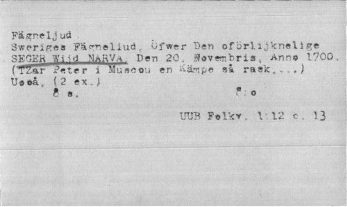 //// Fagre ljud //// Sweriges Fä«*nellud. wfwer Den oförliknelige SEGEH Wild Mft.KV.-v Den 20, »•?er.bris, Anne 1700, (TUar reter i Museou en &ämpe så rask,..,,) Uooå, (2 ex.j //// 8 s. o //// UUB Folkv. 1'12 c. 13 ////