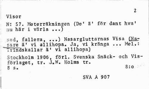 //// 2 //// Visor //// Ni 57. Meterräkningen (De' ä' för dant hva' nu här i värla ...) //// sed, fallera, ...) Nasargluttarnas Visa (Na-_ sare ä' vi allihona. Ja, vi kränga ... Mel.: " Irindskallar ä' vi allihopa) //// Stockholm 1906, förl. Svenska Snäck- och Visförlaget, tr. JL»W. Holms tr. 8 s. 8:o //// SVA A 907 ////