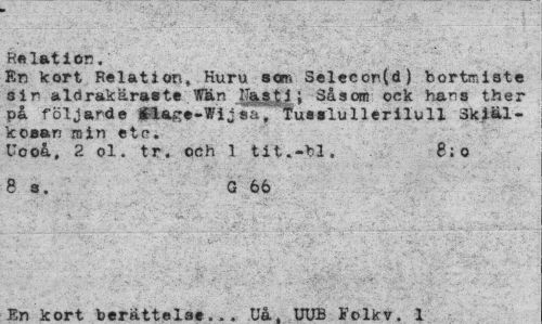 //// Relation. //// JSn kort Relation» Huru som Selecon(d) bortmiste sin aldrakäraste Wän Hast i ; Såsom ock hans ther på följande Ét&ge-Wijsa, "fuaalullerilull Skiäl-koean min etc. //// Uooå, 2 ol. tr. och 1 tit.-"bl. 8; o //// 8a. G 66 //// En kort berättelse... Uå. UUB Folkv. 1 ////