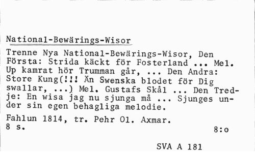 //// National-Bewärings-Wisor //// Trenne Nya National-Bewärings-Wisor, Den Första: Strida käckt för Fosterland ... Mel. Up kamrat hör Trumman går, ... Den Andra: Store Kung(J JI Än Swenska blodet för Dig swallar, ...) Mel. Gustafs Skål ... Den Tredje: En wisa jag nu sjunga må ... Sjunges under sin egen behagliga melodie. //// Fahlun 1814, tr. Pehr 01. Axmar. 8 s. 8:o //// SVA A 181 ////