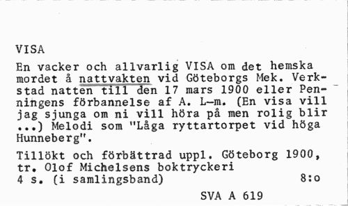 //// VISA //// En vacker och allvarlig VISA om det hemska mordet å nattvakten vid Göteborgs Mek. Verkstad natten till den 17 mars 1900 eller Penningens förbannelse af A. L-m. (En visa vill jag sjunga om ni vill höra på men rolig blir ...) Melodi som "Låga ryttartorpet vid höga Hunneberg". //// Tillökt och förbättrad uppl. Göteborg 1900, tr. Olof Michelsens boktryckeri 4 s. (i samlingsband) 8:o //// SVA A 619 ////