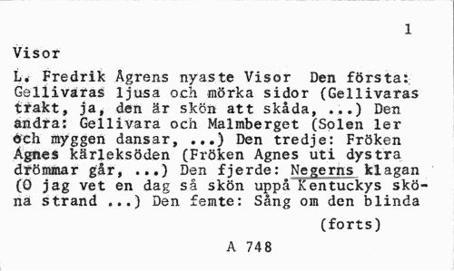 //// 1 //// Visor //// L. Fredrik Ågrens nyaste Visor Den första: Ge11ivaras ljusa och mörka sidor (Gellivaras trakt, ja, den är skön att skåda, ...) Den andra: Gellivara och Malmberget (Solen ler öch myggen dansar, ...) Den tredje: Fröken Agnes kärleksöden (Fröken Agnes uti dystra drömmar gar, ...) Den fjerde: Negerns klagan (0 jag vet en dag så skön uppå Kentuckys sköna strand ...) Den femte: Sång om den blinda //// (forts) //// A 748 ////