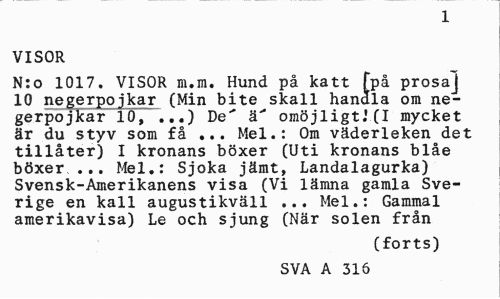 //// 1 //// VISOR //// N:o 1017. VISOR m.m. Hund på katt fpå prosa] 10 negerpojkar (Min bite skall handla om negerpojkar 10, ...) De' ä" omöjligt.'(I mycket är du styv som få ... Mel.: Om väderleken det tillåter) I kronans böxer (Uti kronans blåe böxer ... Mel.: Sjoka jämt, Landalagurka) Svensk-Amerikanens visa (Vi lämna gamla Sverige en kall augustikväll ... Mel.: Gammal amerikavisa) Le och sjung (När solen från //// (forts) //// SVA A 315 ////