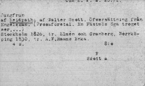 //// /yngfrun //// af I eidt-aih; af .Valter Scott. öfwers&ttnirg från EngSfrSsTtTv™ ( Presaf öretal. En Fästmös o ga troget ser...} //// Stockholm 1826, tr. Limen ooh Granberg, Norrköping 1&3Ö, tr. A.F.Raaae Inka. //// 43. 8;o //// F //// Scott a ////