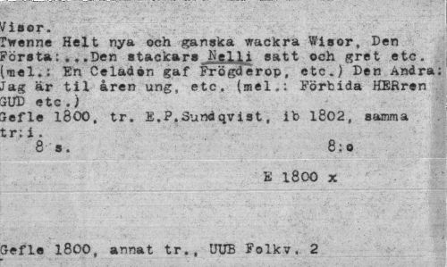 //// r isor. //// !>enne Helt nya oeh ganska vrackra Wisor, Den första.Den stackars J^eili satt och gret etc. ,mel.: En Celadén gaf frögderop, etc.) Den Andra: rag är til åren ung, etc. (mel.: Förtida HERren JUD etc.) //// Jefle 1800, tr. E.P.Sundqvist, ib 1802, samma :r:i. //// 8 s. 8;o //// E 1800 x //// Jefle 1800, annat tr., UUE Folkv. 2 ////