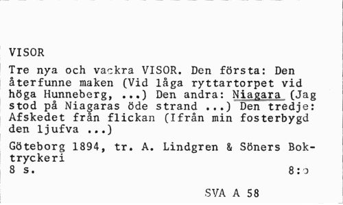 //// VISOR //// Tre nya och vackra VISOR. Den första: Den återfunne maken (Vid låga ryttartorpet vid höga Hunneberg, ...) Den andra: Niagara (Jag stod på Niagaras öde strand ...) Den tredje: Afskedet från flickan (Ifrån min fosterbygd den ljufva ...) //// Göteborg 1894, tr. A. Lindgren & Söners Boktryckeri //// 8 s. 8:0 //// SVA A 58 ////