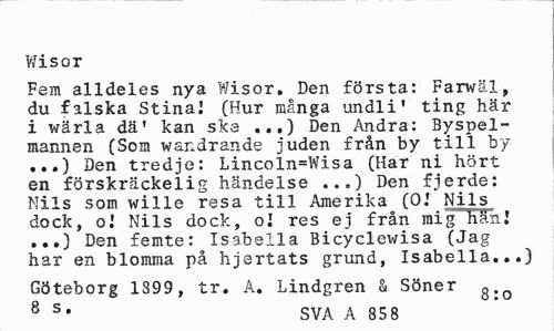 //// Wisor //// Fem alldeles nya Wisor. Den första: Farwäl, du falska Stinal (Hur många undli' ting här i wärla dä' kan ske ...) Den Andra: Byspel-mannen (Som wandrande juden från by till by ...) Den tredje: Lincoln=Wisa (Har ni hört en förskräckelig händelse ...) Den fjerde: Mils som wille resa till Amerika (OJ Nils dock, oj Nils dock, oj res ej från mig hänI ...) Den femte: Isabella Bicyclewisa (Jag har en blomma på hjertats grund, Isabella...) //// Göteborg 1399, tr. A. Lindgren & Söner g.o //// 8 s* SVA A 85 8 ////