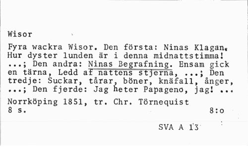 //// Wisor //// Fyra wackra Wisor. Den första; Ninas Klagan* Hur dyster lunden är i denna raidnatts timma 1 ...; Den andra; Ninas Begrafning. Ensam gick en tärna, Ledd af nattens stjerna, Den //// tredje: Suckar, tårar, böner, knäfall, ånger, Den fjerde: Jag heter Päpageno, jagl ... //// Norrköping 1851, tr. Chr. Törnequist 8 s. 8:o //// SVA A 13 : ////