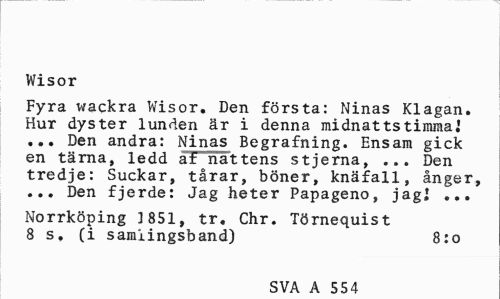 //// Wisor //// Fyra wackra Wisor. Den första: Ninas Klagan. Hur dyster lunden är i denna midnattstimma.' ... Den andra: Ninas Begrafning. Ensam gick en tärna, ledd af nattens stjerna, ... Den tredje: Suckar, tårar, böner, knäfall, ånger, ... Den fjerde: Jag heter Papageno, jag! ... //// Norrköping ]851, tr. Chr. Törnequist 8 s, (i samlingsband) 8:0 //// SVA A 5 554 ////