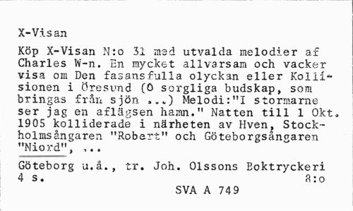 //// X-Visan //// Köp X-Visan N:o 31 med utvalda melodier af Charles W-n. En mycjket allvarsam och vacker visa om Den fasansfulla olyckan eller Kollisionen i Öresund (0 sorgliga budskap, som bringas från sjön ...) Melodi:"I stormarne ser jag en aflägsen hamn." Natten till 1 Okt0 1905 kolliderade i närheten av Hven, Stockholmsångaren "Robert" och Göteborgsångaren "Niord", //// Göteborg u.å., tr. Joh. Olssons Boktryckeri 4 s. 8:o //// SVA A 749 ////