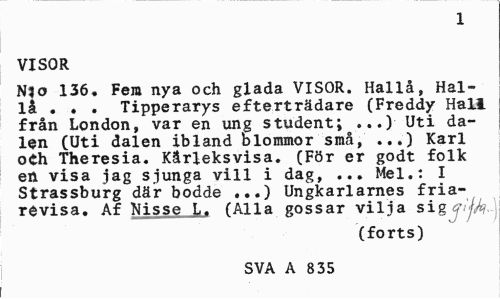 //// 1 //// VISOR //// Njo 136, Fem nya och glada VISOR. Hallå, Hal-lå . . . Tipperarys efterträdare (Freddy Hall från London, var en ung student; ...) Uti dalen (Uti dalen ibland blommor små, ...) Karl oCh Theresia. Kärleksvisa. (För er godt folk en visa jag sjunga vill i dag, ... Mel.: I Strassburg där bodde Ungkarlarnes fria- //// révisa. Af Nisse L. (Alla gossar vilja sig <j!jM- //// (forts) //// SVA A 835 ////