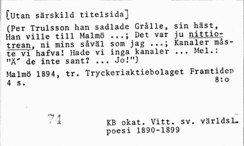 //// [lltan särskild titelsida] //// (Per Trulsson han sadlade Grålle, sin häst, Han ville till Malmö Det var ju nittior //// trean, ni mins såväl som jag Kanaler mås- //// te vi hafval Hade vi inga kanaler ... Mel.: "Ä" de inte sant? ... Jo.'") //// Malmö 1894, tr. Tryckeriaktiebolaget Framtiden 4 s. 8:0 //// ni //// * KB okat. Vitt. sv. världs 1. //// poesi 1890-1899 ////