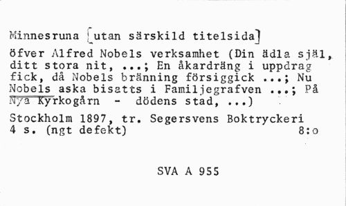 //// Minnesruna jutan särskild titelsida} //// öfver Alfred Nobels verksamhet (Din ädla själ,, ditt stora nit, .En åkardräng i uppdrag fick, då Nobels bränning försiggick Nu //// Nobels aska bisatts i Familjegrafven .På Nya Kyrkogårn - dödens stad, ...) //// Stockholm 1897, tr. Segersvens Boktryckeri 4 s. (ngt defekt) 8:0 //// SVA A 955 5 ////