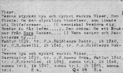 //// Vi a or. //// Twenne stycken nya och Trycket wackra Wiser, Den Första: Cm olycklig» händelsen, som timade //// uti Skifsforssen,.,„ {C menniskal besinna dig, Täriedan du far lefwa,.,,). Den Andra: "Om ett Brud par från Hora Socken,,,, (1 Nor% socken och Bac-ketorpa ty...) //// Fahlur- 1839, tr, P.A.Huldtergs Boktr., ib 1640, //// tr. C.R.Rose 11i, ib 1641, tr, P.A,Huldbergs Boktr . //// Twenne nya och mycket wackra Wisor,... Norrköping 1839, tr. A.F.Raams Knka, Pahlun 1842 tr. J.F,Åkerblom, ib 1843, samma tr:i. ib 16^4, samma tr;i, ib lc47ä summa tr;i, ib 18^1. samma tr; i, 8 s. Qc 8;o ////