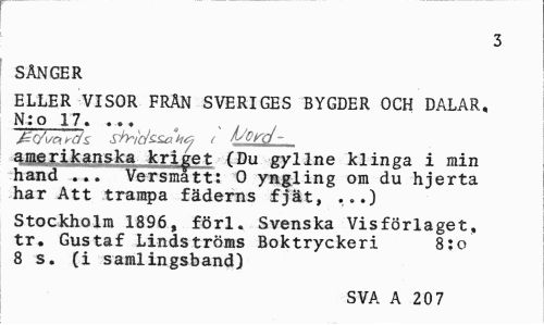 //// 3 //// SÅNGER //// ELLER VISOR FRÄN SVERIGES BYGDER OCH DALAR, N:o 17. , . , //// /=c/vr,KJs shridssefhj < Wra- //// amerikanska kriget (Du gyllne klinga i min hand ... Versmått: O yngling om du hjerta har Att trampa fäderns fjät, ...) //// Stockholm 1896, förl. Svenska Visförlaget, tr, Gustaf Lindströms Boktryckeri 8:o 8 s. (i samlingsband) //// SVA A 20 7 ////