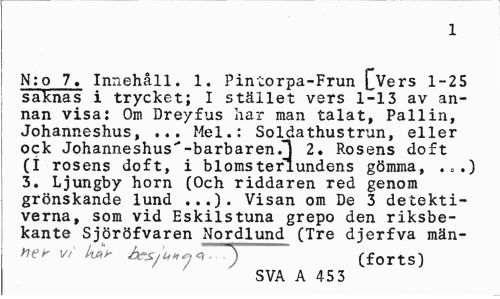 //// 1 //// N:o 7. Innehåll. 1. Pintorpa-Frun [Vers 1-25 saknas i trycket; I stället vers 1-13 av annan visa: Om Dreyfus har man talat, Pallin, Johanneshus, ... Mel.: Soldathustrun, eller ock Johanneshus"-barbaren.1 2. Rosens doft (i rosens doft, i blomsterlundens gömma, .».) 3. Ljungby horn (Och riddaren red genom grönskande lund ...). Visan om De 3 detektiverna, som vid Eskilstuna grepo den riksbekante Sjöröfvaren Nordlund (Tre djerfva män- //// y>er vi hJb bes/iivjq. (forts) //// SVA A 45 3 ////
